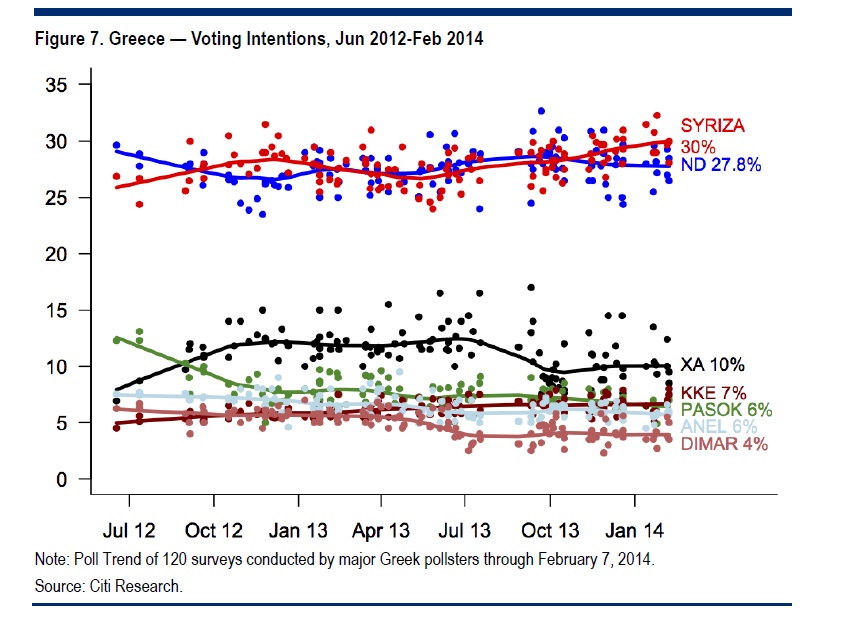 Ακόμη κι αν δεν διεξαχθούν εκλογές εντός του 2014, η Citigroup επιμένει πως θα πραγματοποιηθούν στις αρχές του 2015, καθώς ο ΣΥΡΙΖΑ έχει ήδη δηλώσει πως θα προκαλέσει το στήσιμο της κάλπης, στις κρίσιμες διεργασίες για την ανάδειξη του Προέδρου της Δημοκρατίας.